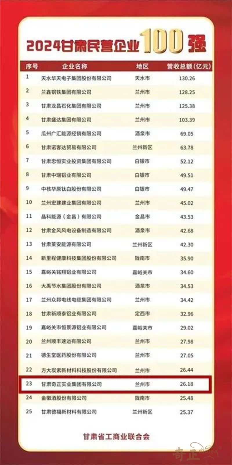 日前,2024 甘肅民營企業(yè) 100 強發(fā)布會暨“民營企業(yè)進邊疆”活動在酒泉隆重舉行。甘肅奇正實業(yè)集團有限公司憑借其卓越的經營業(yè)績和穩(wěn)健的發(fā)展態(tài)勢,榮膺100強榜單第23位。